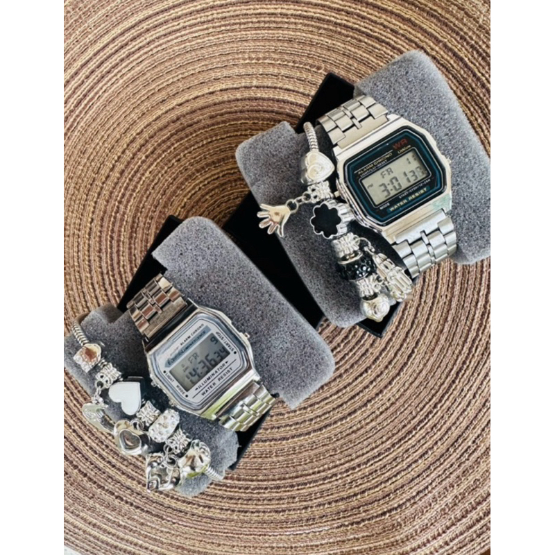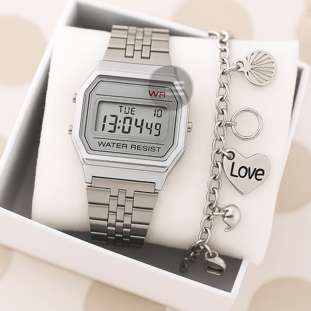 Kit relógio Cassio + Pulseira+ Caixa Tipo Retro Digital LED Feminino Baratinho