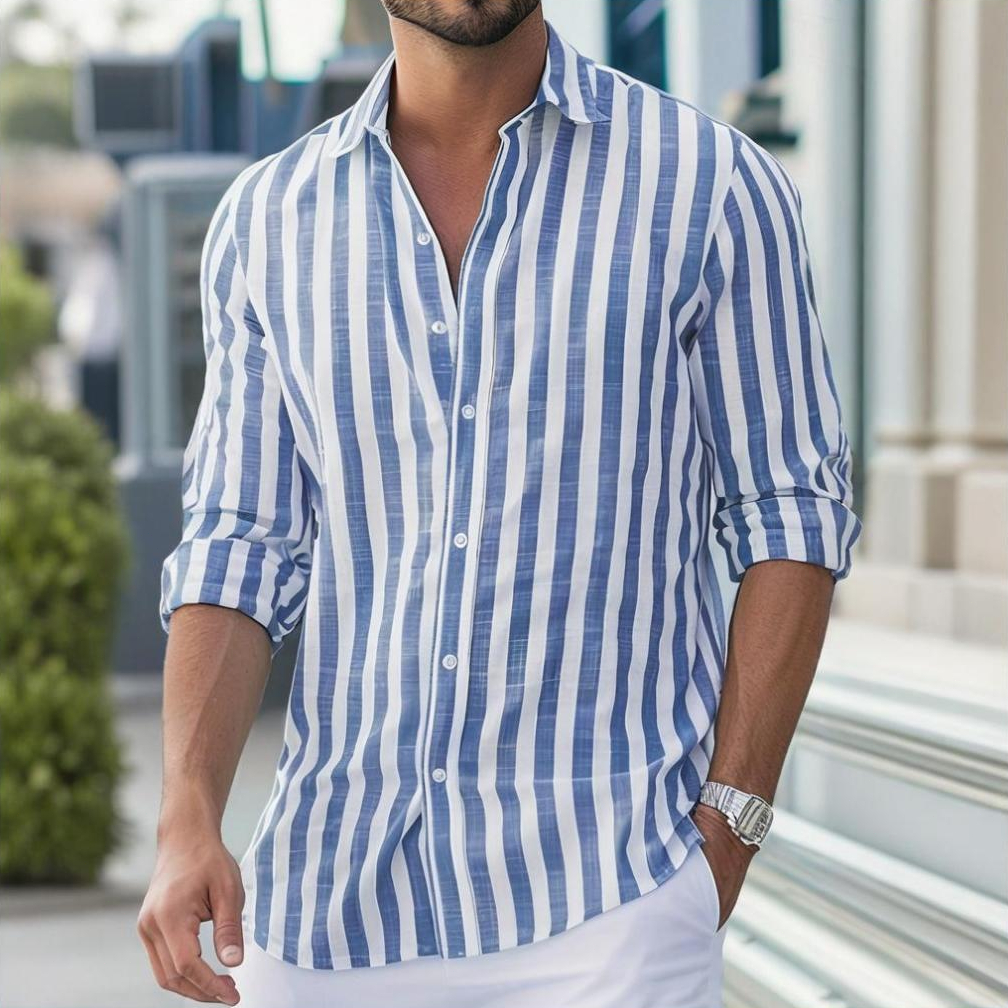 Camisa Social Masculina Casual De Verão Manga Longa Com Listras E Linho Gola Botão