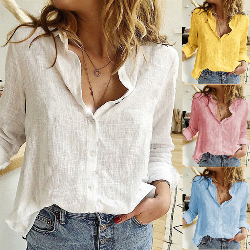 Camisa De Linho Feminina Com Manga Comprida E Cor Lisa Para Escritóri Algodão /Linen/Manga Longa/Loose/Lisa/Casual Camisa