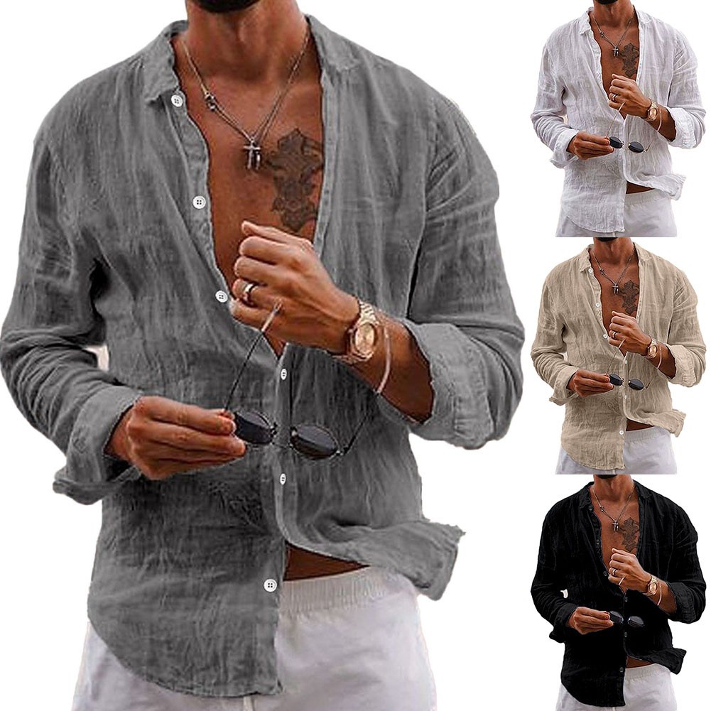 Camisa masculina de linho e algodão casual de manga longa e fina de praia