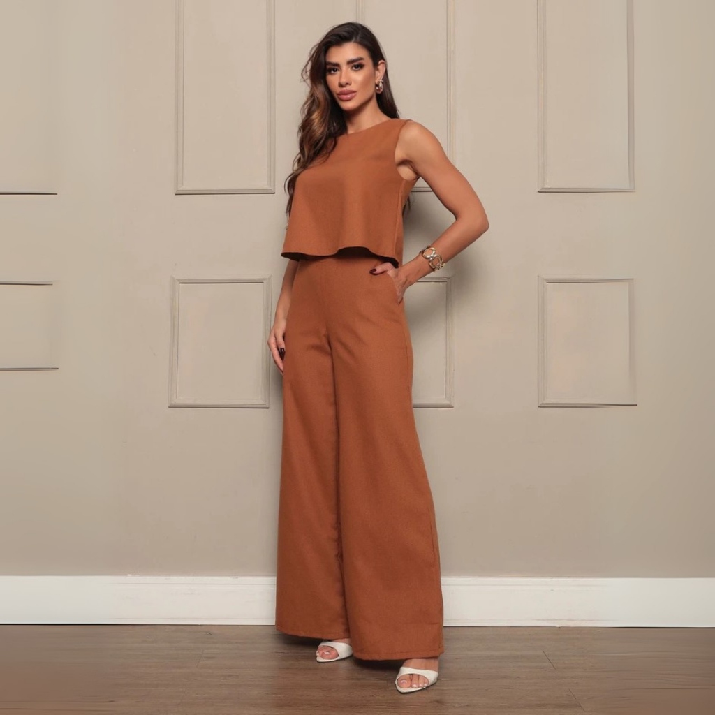 Conjunto Linho original calça wide leg pantalona e blusa regata Femina Moda Roupa Promoção