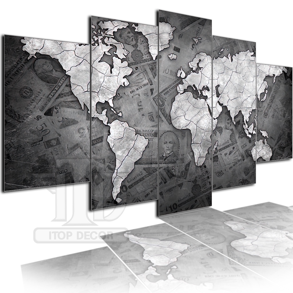 Quadro 5 Peças Mosaico Mapa Mundi Preto E Branco 4k Mdf6mm