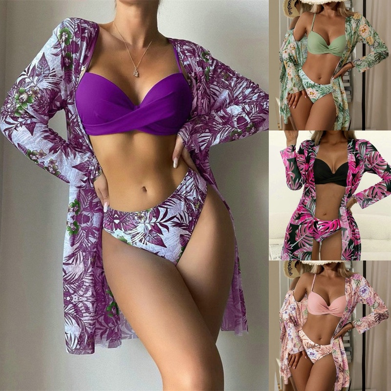Biquíni Cintura Alta kit 3 biqini feminino com bojo biquine conjunto Camisa De Três Peças Estampa kimono Rosa