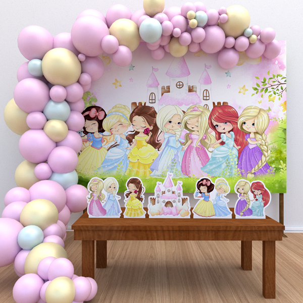 Kit Ouro Festa Aniversário Princesas Aquarela Modelo 2 Desenho Decoração Cenários