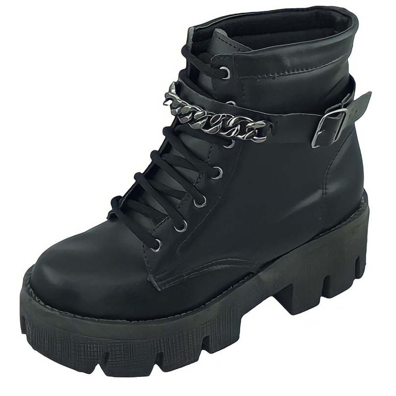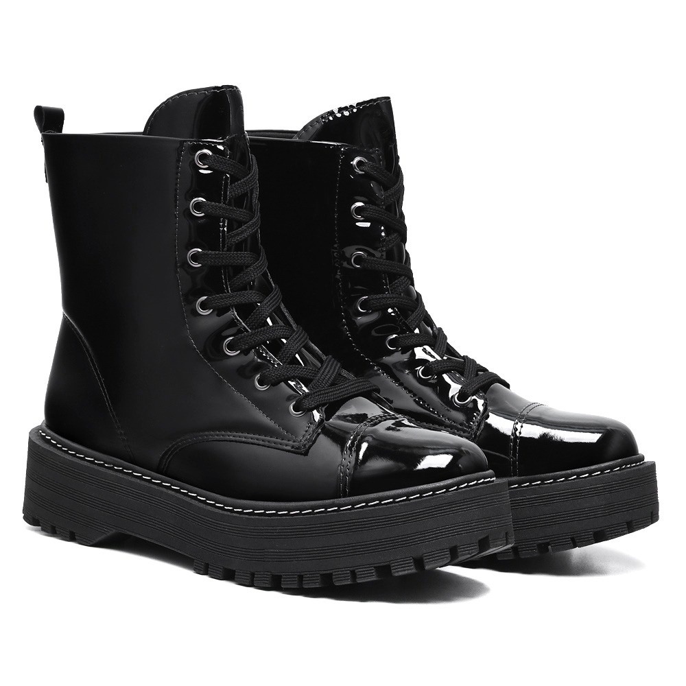 Bota Coturno Feminino Plataforma Tratorado Novo Donatella Shoes Cano Medio Militar Preto com Cadarço Botinha