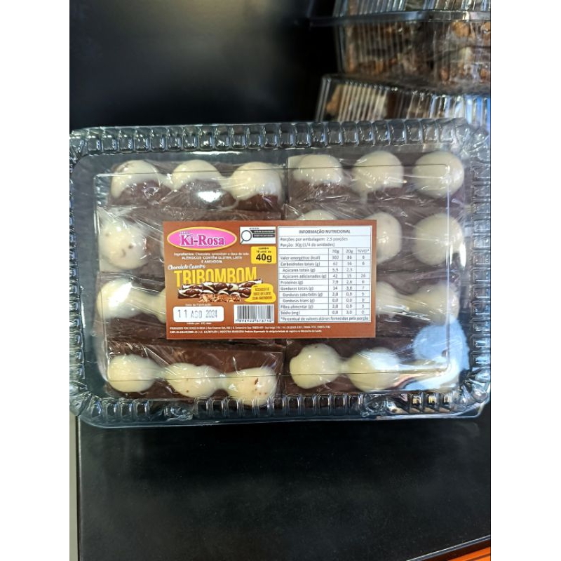 chocolate , amendoim e doce de leite Tribombom uma delícia em caixa com 18 unidades