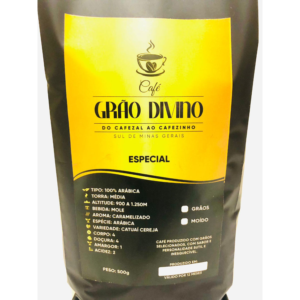 Café Grão Divino Chocolate e Caramelo Torrado Em Grãos 86pts SCA Especial Pacote com 500 Gramas com Válvula Aromática