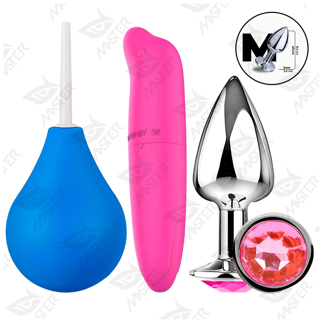 Kit Plug Anal M + Vibrador Feminino Sexual Ponto G Liso Golfinho + Ducha Higiênica Anal 220ml