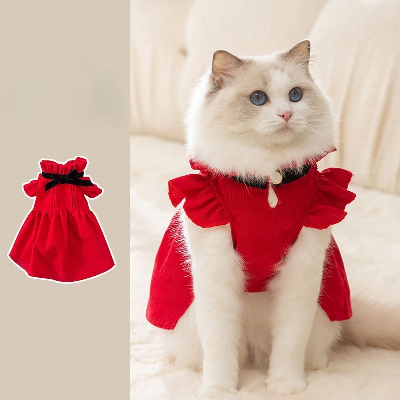 Roupas Para Cães Gatos De Estimação Saia De Manga Voadora Vermelha Vestido De Natal Verão Princesa Fina Laço
