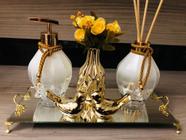 Kit Lavabo Dourado Branco 6 Peças Difusor Sabonete Bandeja