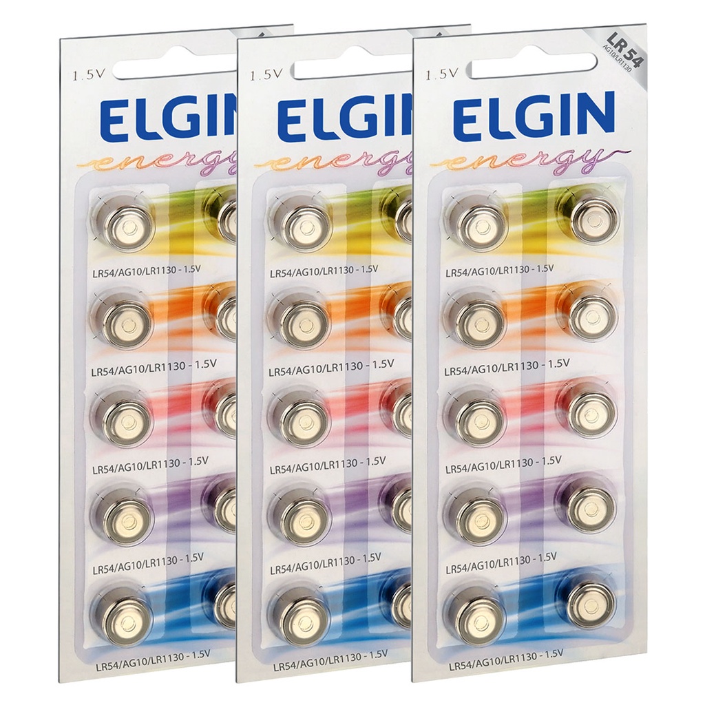 30 Pilhas Baterias LR1130 Elgin LR54 AG10 Alcalina 3 Cartela