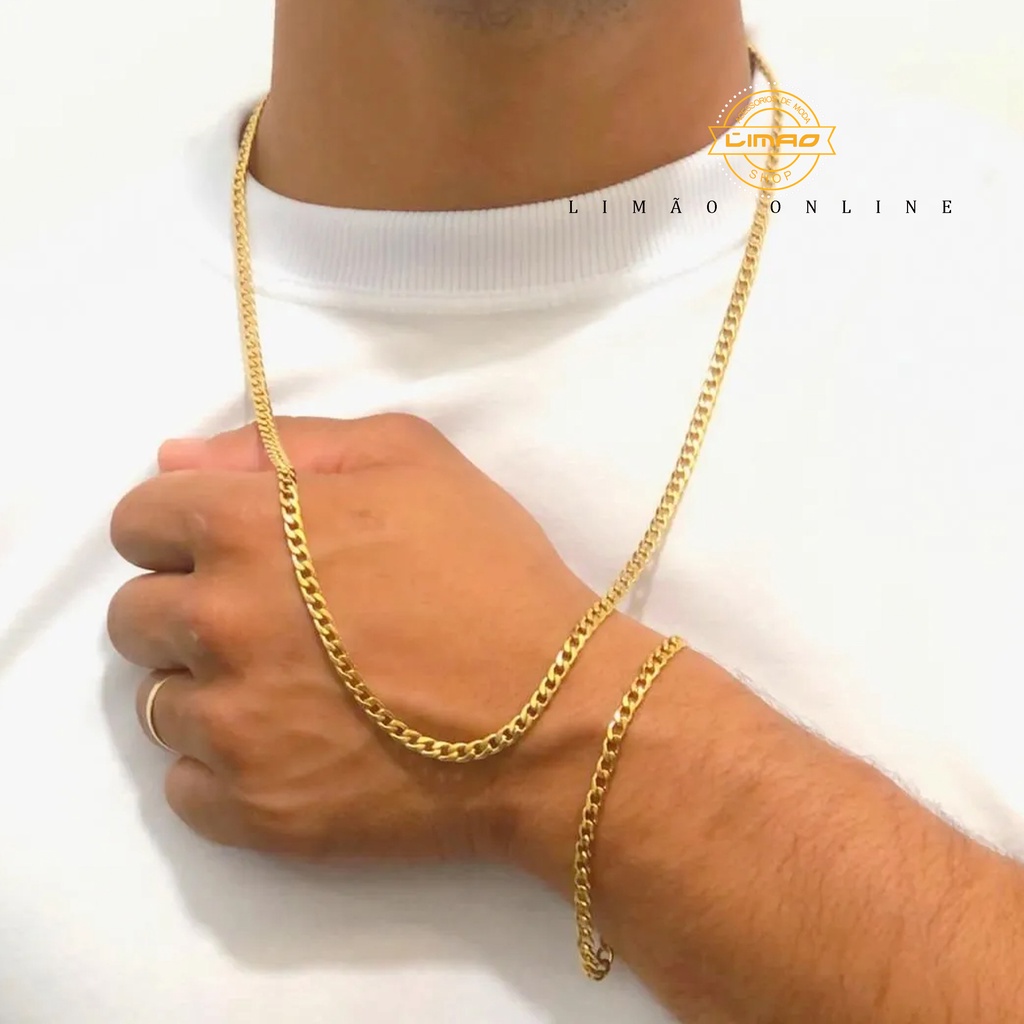 Combinação de corrente e pulseira masculina de aço inoxidável dourado