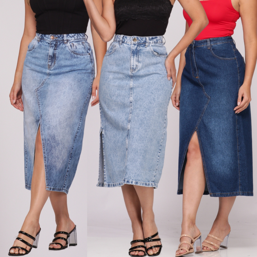 Saia Jeans Feminina Longa Cintura Alta Evangélica Midi Com Abertura