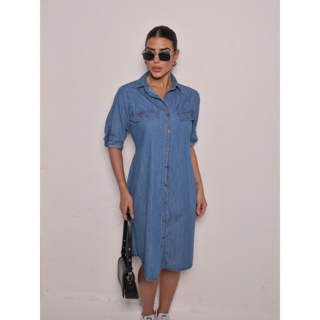 Vestido Chamise Jeans Camisa Manga Longa Com Botões e Lastex