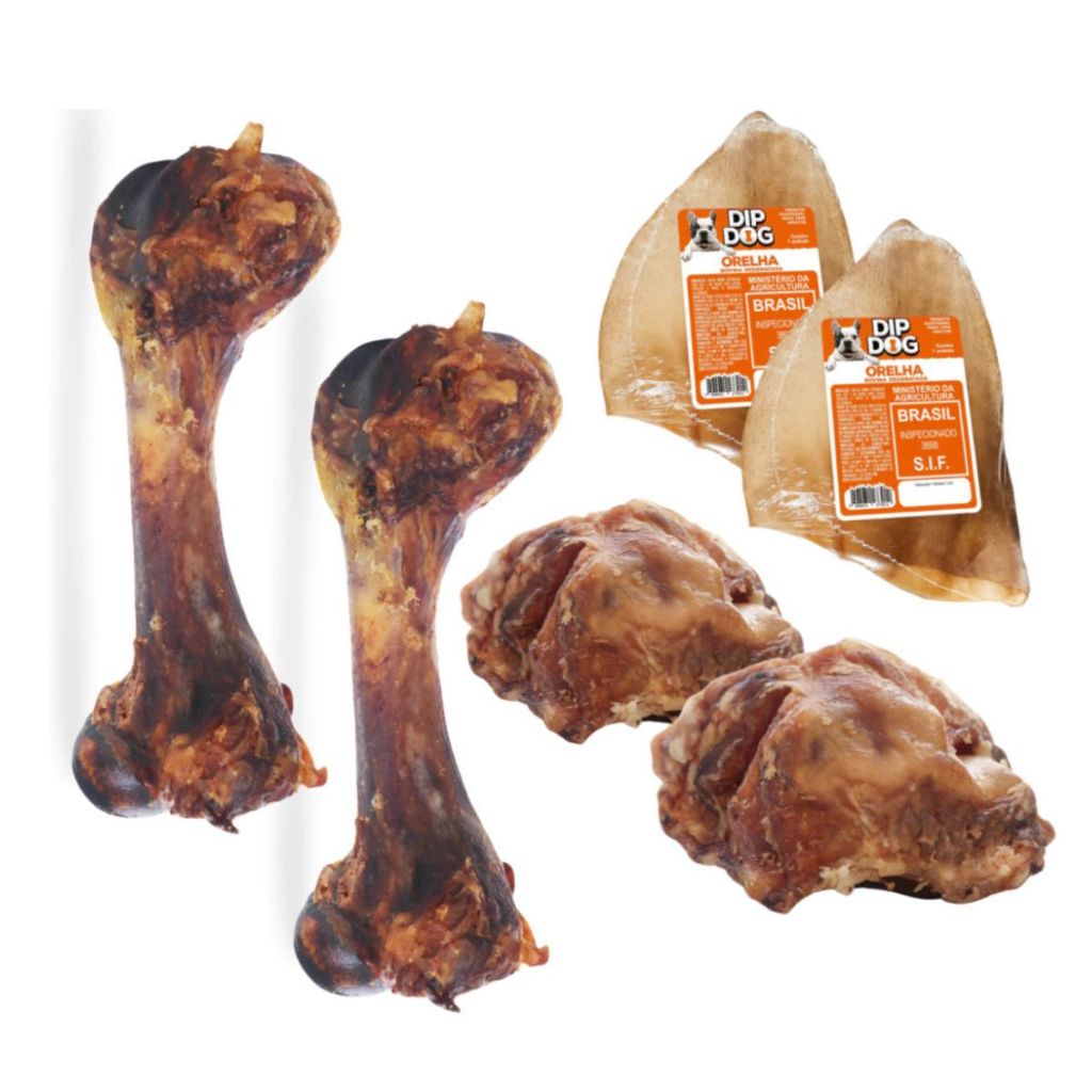 Kit Petisco para caes Osso mordedor 2 Orelha Bovina 2 femur suino 2 Rotula desidratado 100% natural