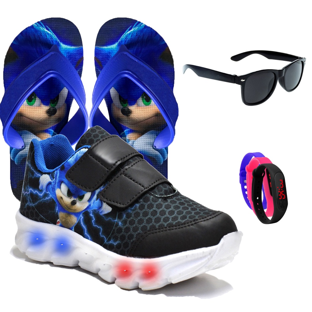 kit Tênis Masculino Infantil De Led Meninos Sonic Velcro Preto Royal + Chinelo + Óculos e Relógio Linkito
