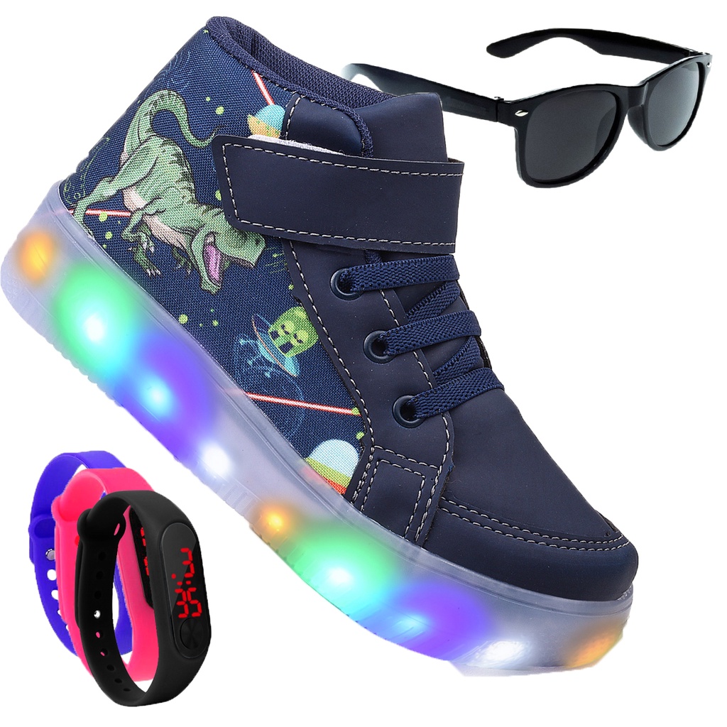 Kit Botinha Masculino Infantil Tenis De Led Meninos Dinossauro Marinho Velcro + Óculos e Relógio GeG Magazine