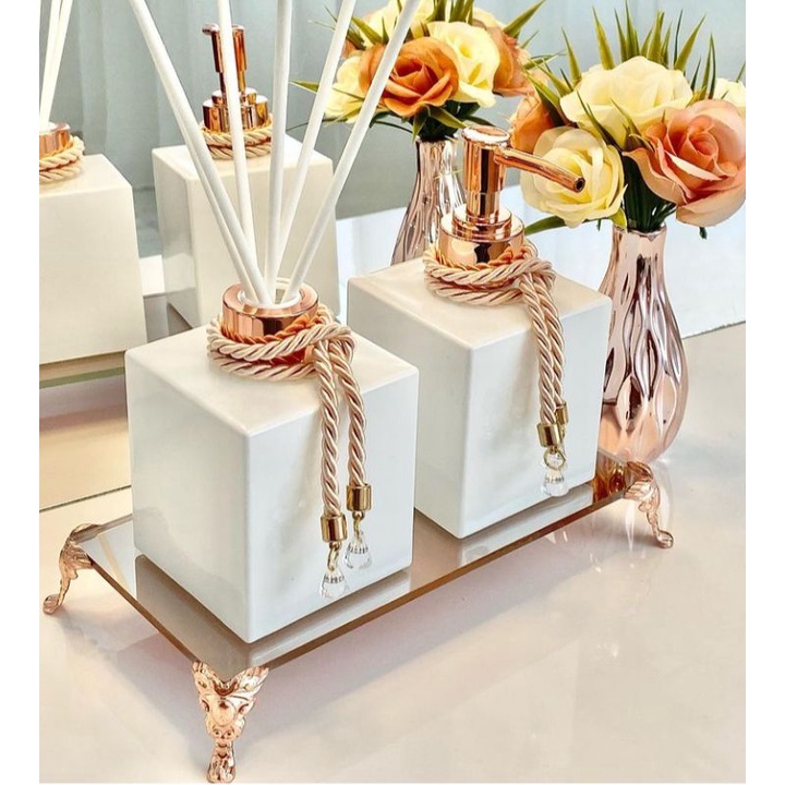 Kit Lavabo Branco Quadrado com Detalhes Rose Gold, Prata ou Dourado