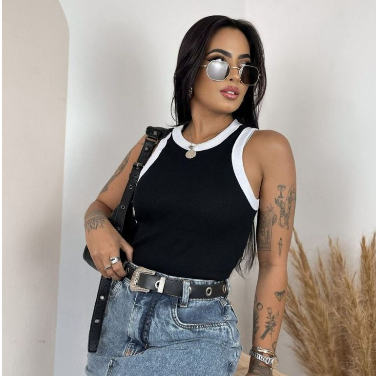 Blusa Feminina Regata Bicolor De Algodão blusinha Básica Canelada Ribana