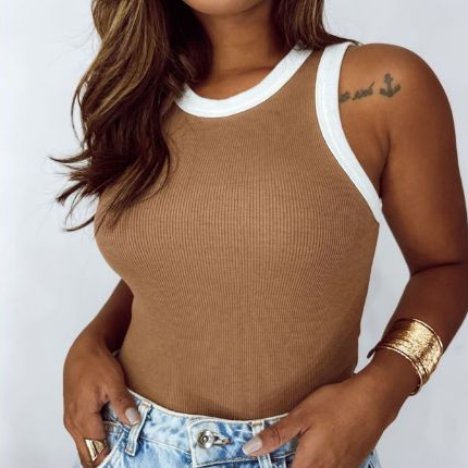Blusa Regata Feminina Casual Bicolor Americana Canelada Ribana Básica Moda Blogueira Candy Color Algodão e Poliester