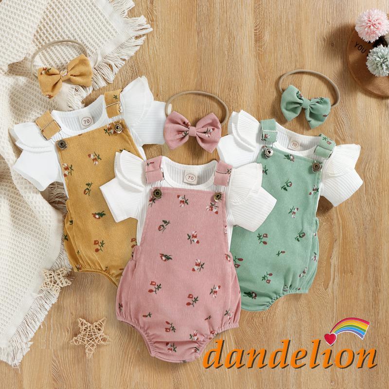 Conjunto de Roupas para Bebê Menina 0-18 meses Camiseta de Manga Curta, Macacão, Faixa de Cabelo com Laço