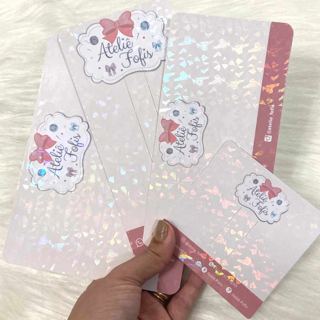 Tag/Papeleta personalizada com sua marca para laços - Laminação Holográfica - Kit com 100 unidades