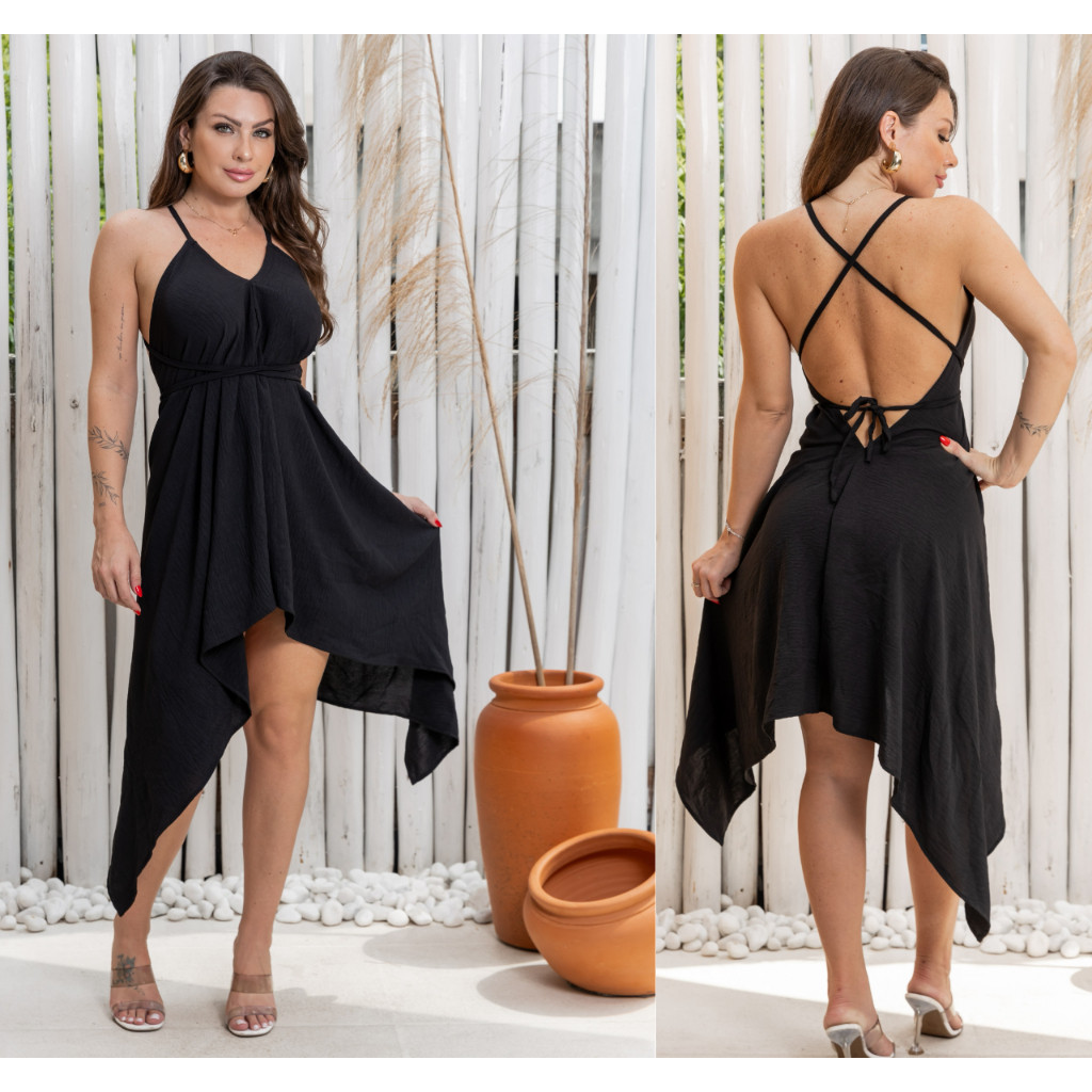 Vestido de Alça Com Bojo Verão Solto Branco Preto Reveillon Assimétrico com Decote V e Amarração Varias Cores Longo Curto Vestidos Feminino De Alcinha