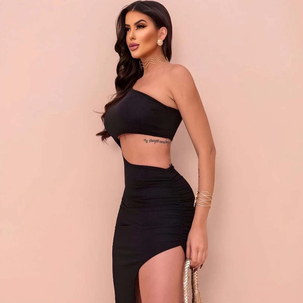 Vestido Feminino Mídi Mula Manca Com Fenda Lateral Alça Única Mídi