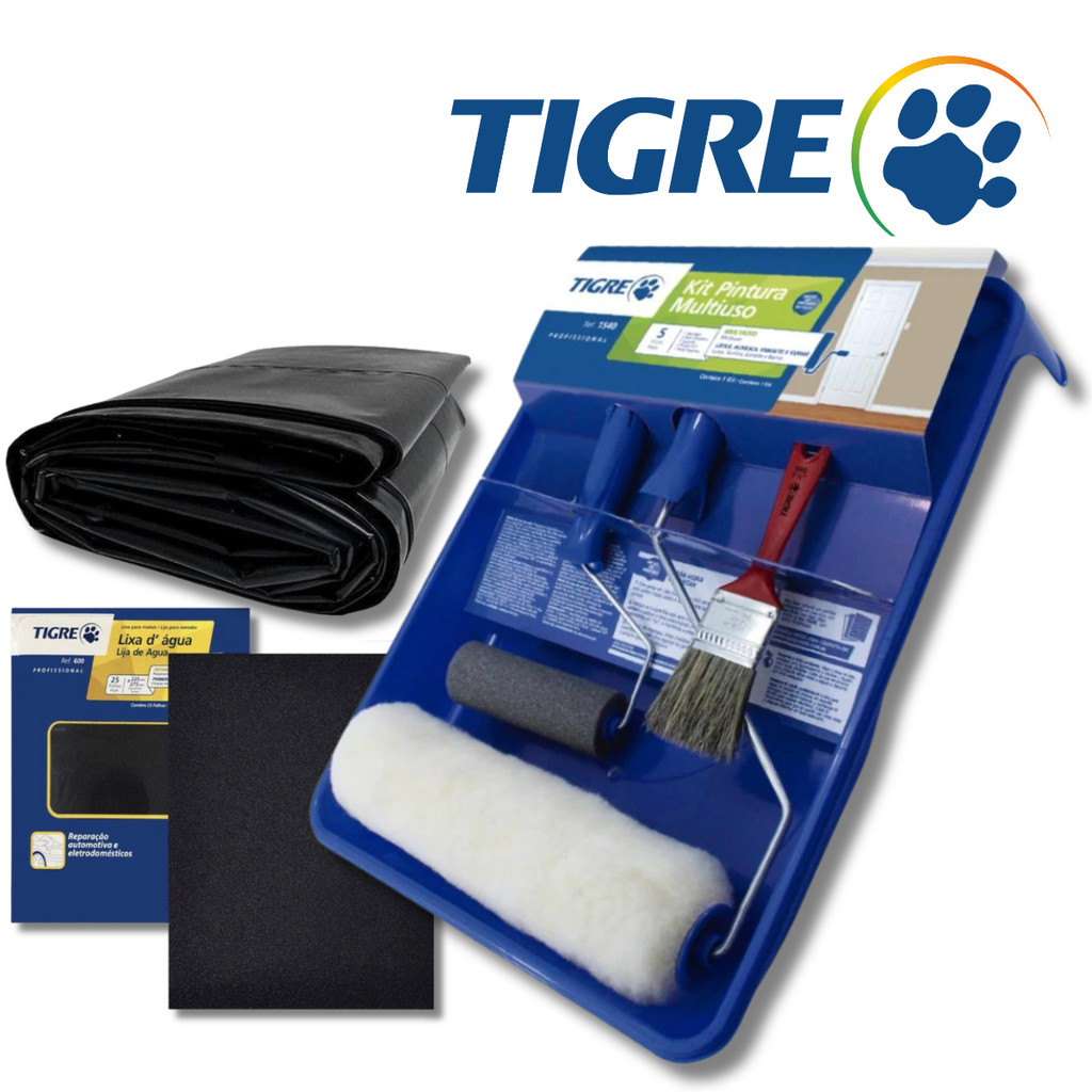 Kit Pintura Parede Rolo Econômico Tigre 5 Peças Completo + 2 Metros de Lona + 2 Lixas D'água Tigre