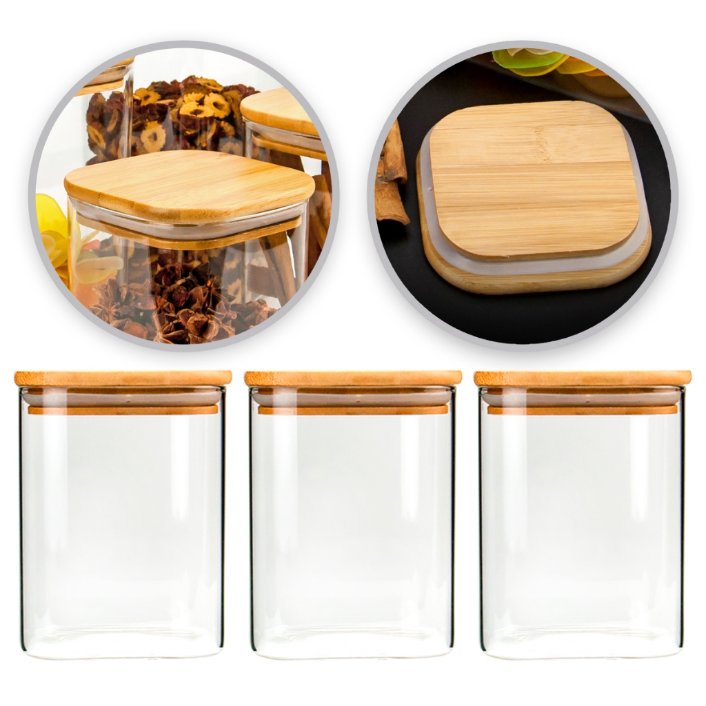 Kit 3 Potes Vidro 750ml Quadrado Com Tampa De Bambu hermético porta Tempero mantimentos hermeticos 750 ml 10cm x 12cm madeira jogo para cozinha c/ pote Grande mantimento café açucar Doces