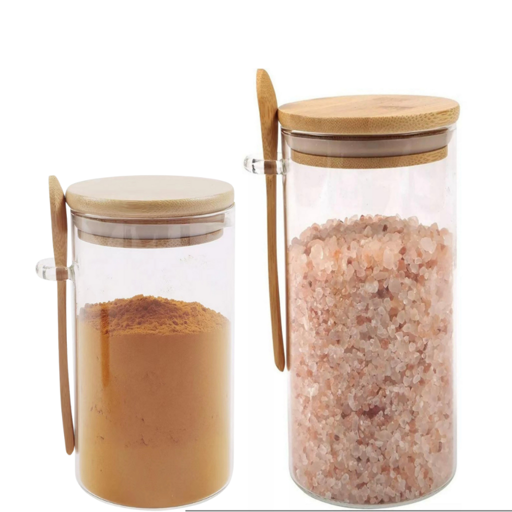 Kit 2 Pote Hermético de vidro transparente Tampa e Colher de Bambu Quadrado Para Mantimentos