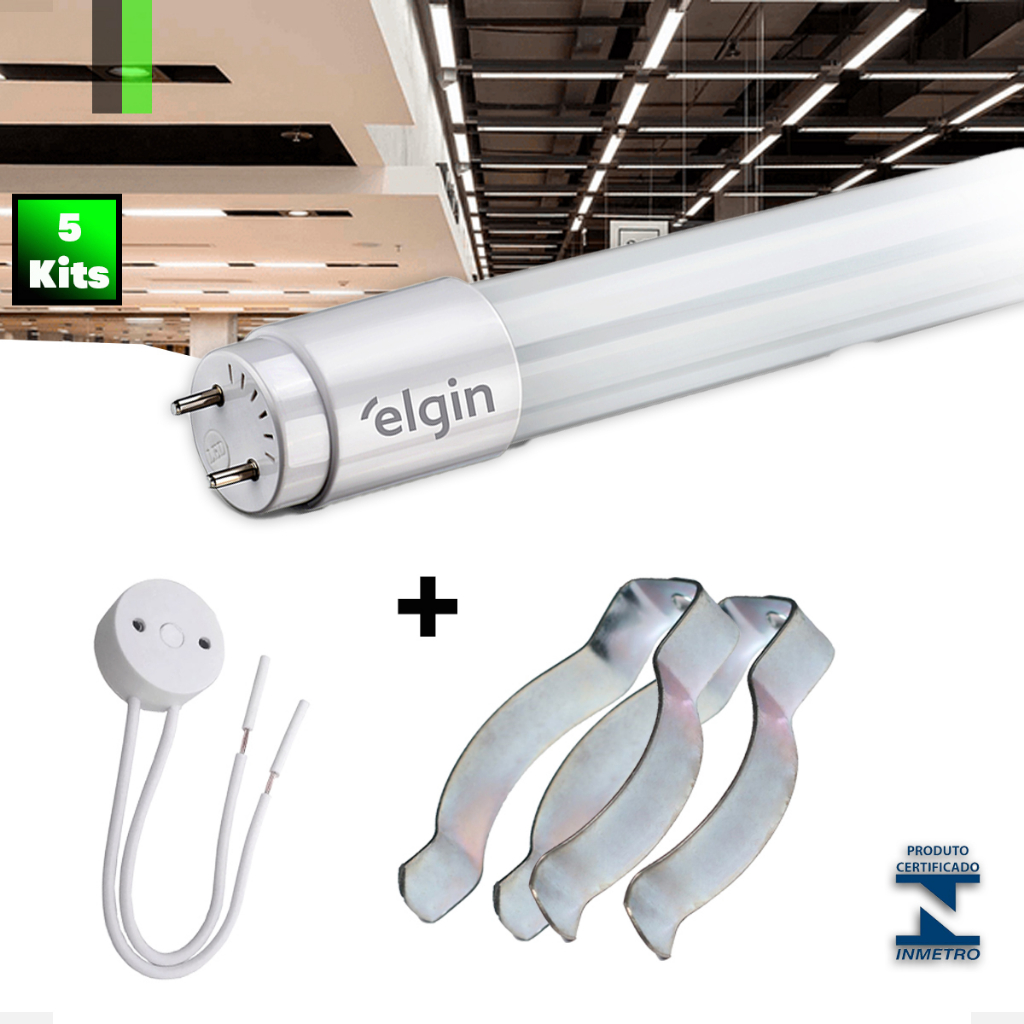 Kit 5 Peças Lâmpada Tubular De Led 120cm 20w T8 6500k Branco Frio 1850lm Vidro Bivolt 1 Lado + Conector T8 + Abraçadeiras