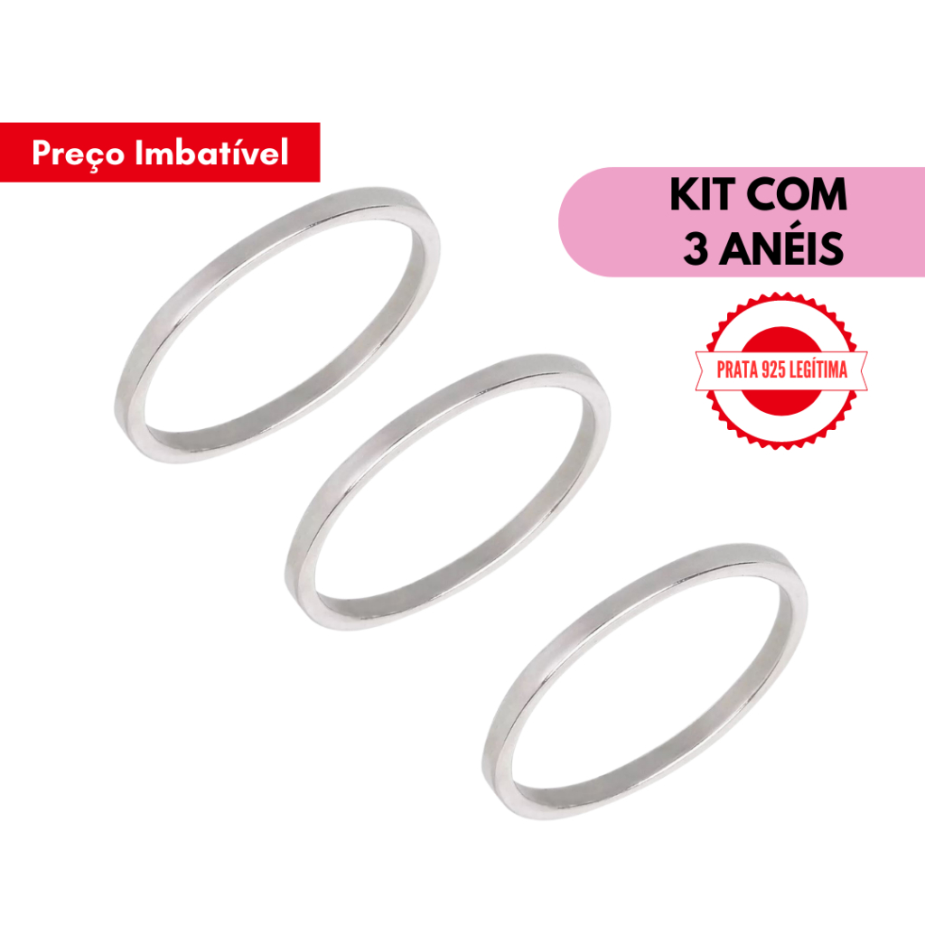 Kit - 3 Anéis Prata 925 Legítima Liso Quadrado 1,2mm Aliança Minimalista Original